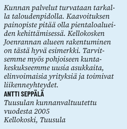 Tuusulaa tulee kehittää osana Helsingin seutua. Erinomainen sijaintimme lähellä lentokenttää ja pääkaupunkia tarjoaa mahdollisuuksia, joita on hyödynnettävä. Kunnan on aktiivisesti houkuteltava uusia asukkaita ja yrityksiä.