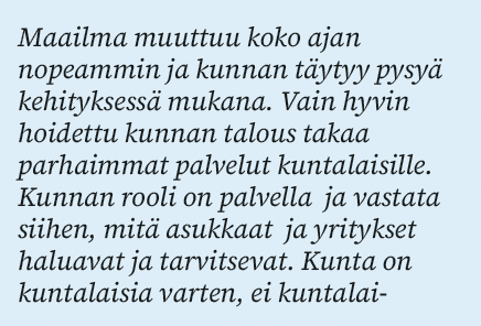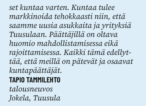 Kaiken tämän mahdollistaa vastuullinen taloudenpito. Verovarat on käytettävä tehokkaasti, ja Tuusulan veroprosentin on oltava kilpailukykyinen naapurikuntiin nähden. Näin varmistamme, että Tuusula on houkutteleva paikka asua ja yrittää.