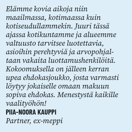 Lähden ehdolle hyvinvointialueen valtuustoon, koska haluan edelleen hyödyntää sote-alan osaamistani kuntalaisten parhaaksi. Olen farmaseutti ja myyntipäällikkö, ja koko työurani olen tehnyt töitä terveydenhuollon parissa. Kokemusta on kertynyt niin lääketukkukaupan tehtävistä kuin terveydenhuollon tarvikkeiden myynnistä ja jakelusta. Olen myös toiminut pitkään sivutyönä apteekissa sekä ollut aktiivisesti mukana sote-päätöksenteossa. Tällä hetkellä olen Tuusulan kunnanvaltuutettu ja hyvinvointialuun palveluidenjärjestämisen lautakunnan jäsen sekä 1. varavaltuutettu. Aiemmin olen toiminut muun muassa sote-lautakunnan puheenjohtajana ja pelastuslaitoksen johtokunnan varajäsenenä.